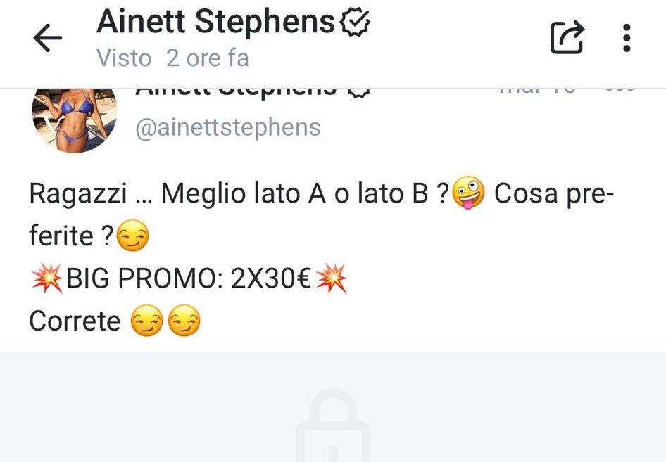 2. Sono d'accordo con Perseo non si può dare la colpa a Pino Insegno che ovviamente sapeva che Ainett fa contenuti su OF e che la RAI ha ovviamente una politica aziendale di servizio pubblico ma molto carinamente ha detto che è un problema di età ovviamente alla presentazione dei Palinsesti RAI che poteva dire...