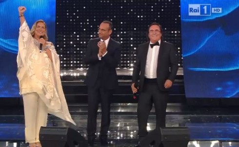 Cara terra mia, Ci sarà, Felicità… Al teatro Ariston, Al Bano e Romina intonano alcuni dei loro successi più noti. Dopo la grande reunion in Russia, ora i due sono uno accanto all’altro su un palco italiano. Ed è subito standing ovation. Carlo Conti chiede loro di avvicinarsi, incoraggiandoli ad una stretta di mano e ad un bacio. L’usignolo di Cellino San Marco prende tempo e scherza (“ho un forte senso del pudore“), poi si accosta a Romina e scatta un bacio abbastanza freddo.