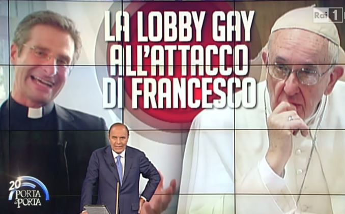 Associazioni gay all’attacco di Bruno Vespa. Il conduttore Rai è stato oggetto di severe critiche da parte di alcuni esponenti della comunità omosessuale per un titolo comparso a Porta a Porta nella puntata di lunedì scorso. Nel programma della rete ammiraglia del servizio pubblico si parlava del caso Charamsa e nel vidiwall alle spalle del giornalista compariva la seguente scritta: “Lobby gay all’attacco di Francesco“. Tanto è bastato per scatenare il vespaio.