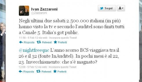 Italia’s Got Talent batte Ballando con le stelle? Apriti cielo, non può essere. Il pubblico del sabato sera aumenta per il freddo e la neve, e si riversa più su Italia’s Got Talent che su Ballando? Impossibile. Qualcuno potrebbe leggere un pizzico di presunzione nei tweet che Ivan Zazzaroni ha iniziato a disseminare su Twitter da quando il varietà di Rai1 in cui lo stesso “Zazza” è impegnato nel ruolo di giudice, non vince la sfida del sabato sera (ecchecaso!).