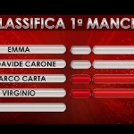 Ore 21.53: Si rientra dalla pausa e Maria chiama i quattro big che si sono già esibiti. Vediamo la classifica, ancora parziale perchè mancano cinque performances, decisa dall’orchestra: comanda Emma, seguita da Pierdavide, Marco e Virginio.