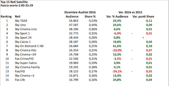 AUDITEL DICEMBRE 2016, SATELLITE: SKY TG24 PRIMO CANALE, CRESCE L’ON DEMAND