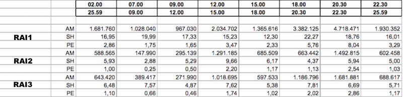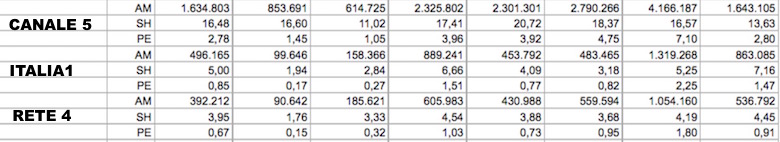 Nel totale giornata, Rai 3 conserva gelosamente la terza posizione (6.48% nelle 24 ore – 6.69% in prima serata), sebbene in leggero calo sia rispetto a marzo sia rispetto all’anno precedente. Medaglia di legno per Rai 2, in discesa fino al 5.93% (meno 0.53 punti dall’anno scorso), rafforzata in daytime solo da I Fatti Vostri e Detto Fatto. La rete di Furore e Nemo segna il 5.94% in prima serata. Al quinto posto c’è la rete giovane di Mediaset: Italia 1 perde terreno e si ferma ad un 5% di share medio sulle 24 ore che sale al 5.25% in prime time. Buona performance in seconda serata con il 7.16%, grazie a programmi come Emigratis e Le Iene. La segue Rete 4 con solo il 3.95% (0.09 punti in meno rispetto a trenta giorni prima) e il 4.19% in prima serata. La7 al 2.78% nelle 24 ore, con il 3.29% in prima serata.