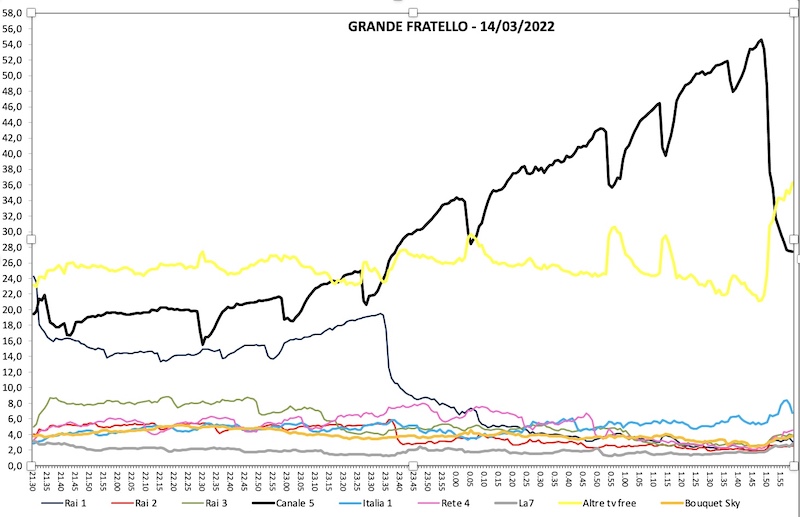Nella serata di ieri, lunedì 14 marzo 2022, su Rai1 la fiction Vostro Onore ha appassionato 3.262.000 spettatori pari al 15.49%. Su Canale 5 – dalle 21.43 all’1.50 – Grande Fratello Vip 6 ha raccolto davanti al video 3.659.000 spettatori pari al 26.06% di share (presentazione di 1 minuto e mezzo: 4.473.000 – 18.13%; 27.2% il dato sul commerciale, qui i dati di tutte le finali). Il picco in valori assoluti si è registrato alle 21.59 pari a 4.852.000 spettatori, quando Signorini ricordava i numeri record dell’edizione; il picco in share si è registrato, sul finale della puntata all’1.48, ossia alla proclamazione, ed è pari al 54.62%. La sesta edizione – la più lunga con 49 puntate all’attivo – iniziata lo scorso 13 settembre ha ottenuto una media di 3.100.000 spettatori con il 20.1% di share (21.3% sul target commerciale).