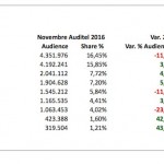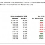 AUDITEL NOVEMBRE 2016: CANALE 5 ANCORA LEADER (16.66%). RAI1 VINCE IN PRIMA SERATA (16.45%), SOFFRE AL POMERIGGIO (12.62%). BENE RAI3 (7.27%), NOVE FERMO ALL’1.05%