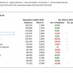 Per quanto riguarda Mediaset, Top Crime (1,0% di share) e Italia 2 (0,40%) evidenziano un decremento in termini di spettatori nell’intorno del -20%. Flessione più contenuta per La 5 che si attesta sullo 0,7% di share. Unica nota positiva per Mediaset Extra (0,65%) che cresce del +24,4% grazie alla coda del live del Grande Fratello Vip. Molto bene Premium Sport (+28,3%) che passa dallo 0,44% allo 0,57% di share. Per Rai e Mediaset il posizionamento e le performance dei canali digitali resta un tema aperto su cui lavorare nel 2017 visti gli andamenti negativi di questi ultimi mesi.