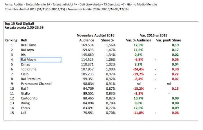 AUDITEL NOVEMBRE 2016: REAL TIME OTTAVO CANALE (1.56%), SEGUE RAI YO YO (1.47%). RAI4 FERMA ALLO 0.87%, ITALIA2 ALLO 0.4%. SU SAT SKY UNO LEADER (0.52%)