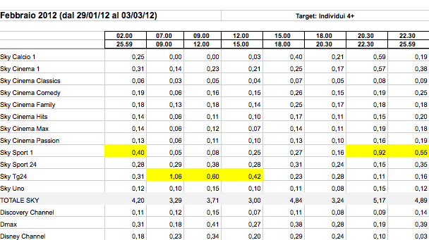 AUDITEL SATELLITE FEBBRAIO 2012: SKY SPORT1 IL CANALE PIU’ VISTO. L’EMERGENZA MALTEMPO RILANCIA SKY TG24 (SOPRA L’1% AL MATTINO), SKYUNO PERDE L’ XFACTOR