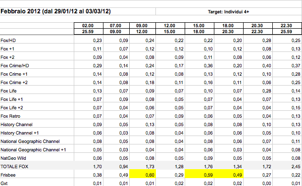 11 commenti su "AUDITEL SATELLITE FEBBRAIO 2012: SKY SPORT1 IL CANALE PIU’ VISTO. L’EMERGENZA MALTEMPO RILANCIA SKY TG24 (SOPRA L’1% AL MATTINO), SKYUNO PERDE L’ XFACTOR"