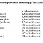 Nel confronto Rai vs Mediaset spicca la totale assenza dell’informazione della tv pubblica nelle classifiche dei più visti sul web. Sport Mediaset e Tgcom 24 svettano, rispettivamente, al secondo e al terzo posto, nella classifica delle produzioni Mediaset per LS, molto indicativa per contenuti brevi come i servizi dei tg o momenti particolari all’interno di un programma. A questo proposito si distinguono anche Le Iene, settimo programma più visto per LS nella classifica Mediaset (e ottavo per TTS nella classifica generale) e Verissimo.