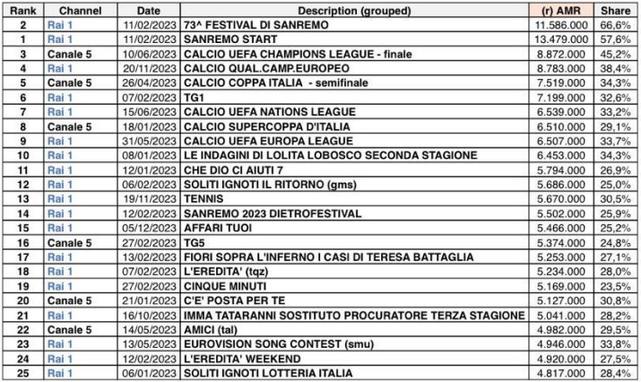 Come ogni anno, il Festival di Sanremo è l’evento che segna gli ascolti più alti. La serata più vista in assoluto, considerati anche i dati differiti, è quella dell’11 febbraio, in occasione della finale, che ha incollato su Rai 1 11.586.000 spettatori, pari al 66.6% di share (preceduta dall’anteprima Sanremo Start a 13.479.000 spettatori e il 57.6%). In seconda posizione un’altra finale ma di calcio: l’8 giugno Manchester City-Inter di Champions League porta Canale 5 al 45.2% (8.872.000). Il calcio fa la voce grossa anche con le partite della Nazionale (Qualificazioni agli Europei e Nations League su Rai 1) e con le competizioni nazionali per club (Coppa Italia e Supercoppa Italiana su Canale 5).