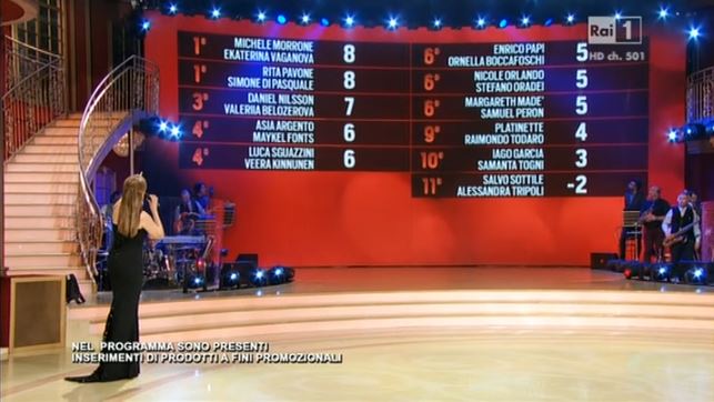 Terminata la prova a sorpresa, prende il via la gara canonica. A differenza delle ultime due settimane, sono rare le interruzioni ad arte fatte per lasciare spazio ai richiami dei ballerini per una notte, i quali nel proprio fugace passaggio hanno collezionato 20 punti di tesoretto con un tango firmato da Cesare Bocci e Sara Mardegan ed un boogie interpretato da Angelo Russo e Maria Ermachkova. Fortunatamente anche il passaggio ballerino di Kung fu Panda è stato rapido, con una esibizione di hip hop. La lunga processione di esibizioni si apre con il paso doble dei pirati Salvo Sottile ed Alessandra Tripoli, seguito dalla rumba senza passione, a dire della giuria, di Iago Garcia e Samanta Togni. Confermano le aspettative positive Michele Morrone ed Ekaterina Vaganova con una samba lenta ma molto apprezzata. Proprio nel commento all’esibizione dell’attore poeta, Mariotto dice addio alla sua credibilità omaggiandolo di un mazzo di fiori da parte di un anonimo ed intonando una canzoncina degna dei Nuovi Mostri. Sorprende l’esibizione finalmente seria ed intensa del tango di Ornella Boccafoschi ed Enrico Papi (il quale poi trascina in pista per pochi attimi anche la Lucarelli), così come conquista pareri positivi anche il paso doble di Nicole Orlando e Stefano Oradei. Proseguono le performance con il tango sensuale di Asia Argento e Mykel Fonts, l’attrice viene omaggiata di un “profondo” profilo narrativo realizzato da Sandro Mayer: “All’inizio eri un pochino antipatica, invece sei sensibile“. Scendono in pista Rita Pavone e Simone Di Pasquale con un charleston forse troppo complesso, mentre la salsa è il ballo di Daniel Nilsson con Valeria Belozerova; il bonus svedese si mostra, insospettabilmente, sempre più simpatico che bello. La coppia numero nove è quella formata da una mora Platinette e Raimondo Todaro, impegnati in un paso doble ed accusati dalla Lucarelli di fare sempre le stesse cose e quindi di annoiare. La serata si chiude, come al solito, con le coppie Margareth Madè e Samuel Peron, protagonisti di una rumba, e Luca Sguazzini e Veera Kinnunen, impegnati con un sorprendente e scanzonato boogie della mezzanotte.
