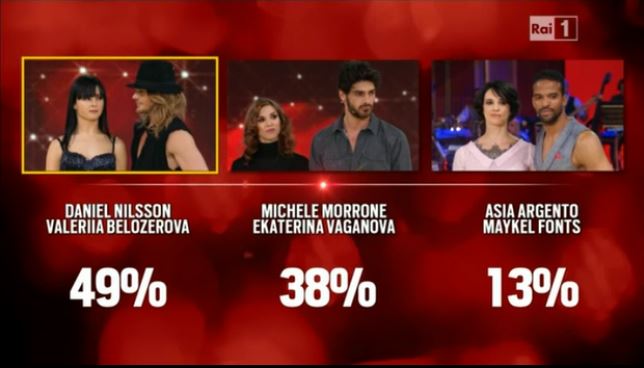 Arriva il momento dello spareggio. Sorprendentemente approdano all’ultimo ballo le coppie di Daniel Nilsson, Michele Morrone ed Asia Argento. Con il 49% il Bonus svedese supera il ballottaggio, accedendo così alla sfida finale con la ripescata Margareth Madè. Con l’82% Daniel supera anche quest’ultimo ostacolo e resta in gara.