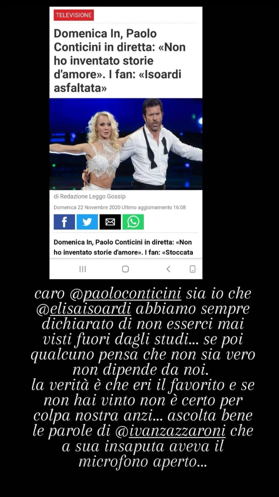 “Caro Paolo Conticini sia io che Elisa Isoardi abbiamo sempre dichiarato di non esserci mai visti fuori dagli studi… se poi qualcuno pensa che non sia vero non dipende da noi. La verità è che eri il favorito e se non hai vinto non è certo per colpa nostra anzi… ascolta bene le parole di Ivan Zazzaroni che a sua insaputa aveva il microfono aperto (‘finisce 5 a 0’ ha detto ma nella storia ripostata il fratello di Todaro scrive ‘devono vincere 5 a 0’, ndDM)…”.