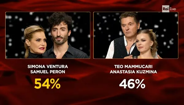 Dopo oltre 12 minuti di blackout, Milly Carlucci è passata alla sfida tra i secondi classificati nella prima manche Simona Ventura e Samuel Peron ed i terzi Teo Mammucari e Anastasia Kuzmina, anche loro in pista con due cavalli di battaglia. Tutti i giurati hanno premiato la conduttrice con il proprio maestro. Terzo classificato a parimerito con Lorenzo Tano, di conseguenza, Teo Mammucari (con Anastasia Kuzmina), fermo al 46% nel cumulo coi social. In finalissima, insieme a Wanda Nara, Simona Ventura.
