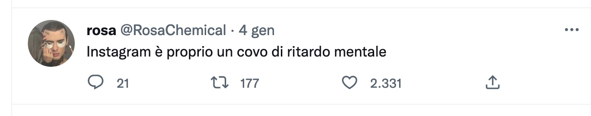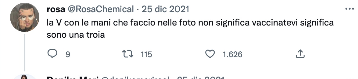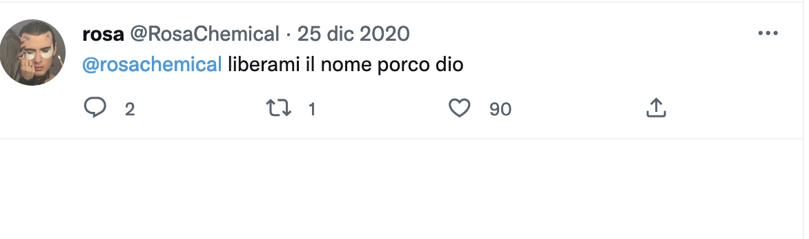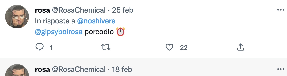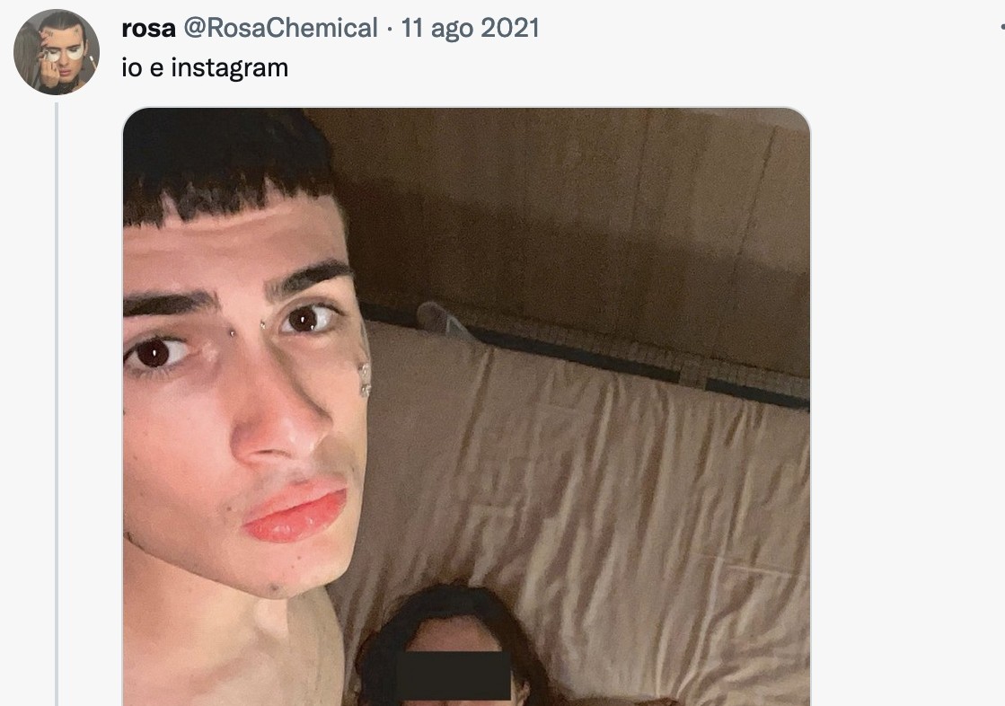 Rosa Chemical ha un profilo Only Fans ma, all’occorrenza, non ha disdegnato foto p*rno su Twitter che “uso come sfogo mentre mi scureggia il cervello” (in un’immagine è completamente nudo ed eccitato mentre una ragazza senza vestiti è ai suoi piedi). Scrive, invece, nella didascalia di una foto con Belen Rodriguez: