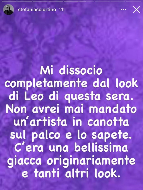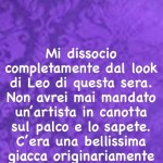 “Mi dissocio completamente dal look di Leo di questa sera. Non avrei mai mandato un artista in canotta sul palco e lo sapete. C’era una bellissima giacca originariamente e tanti altri look“