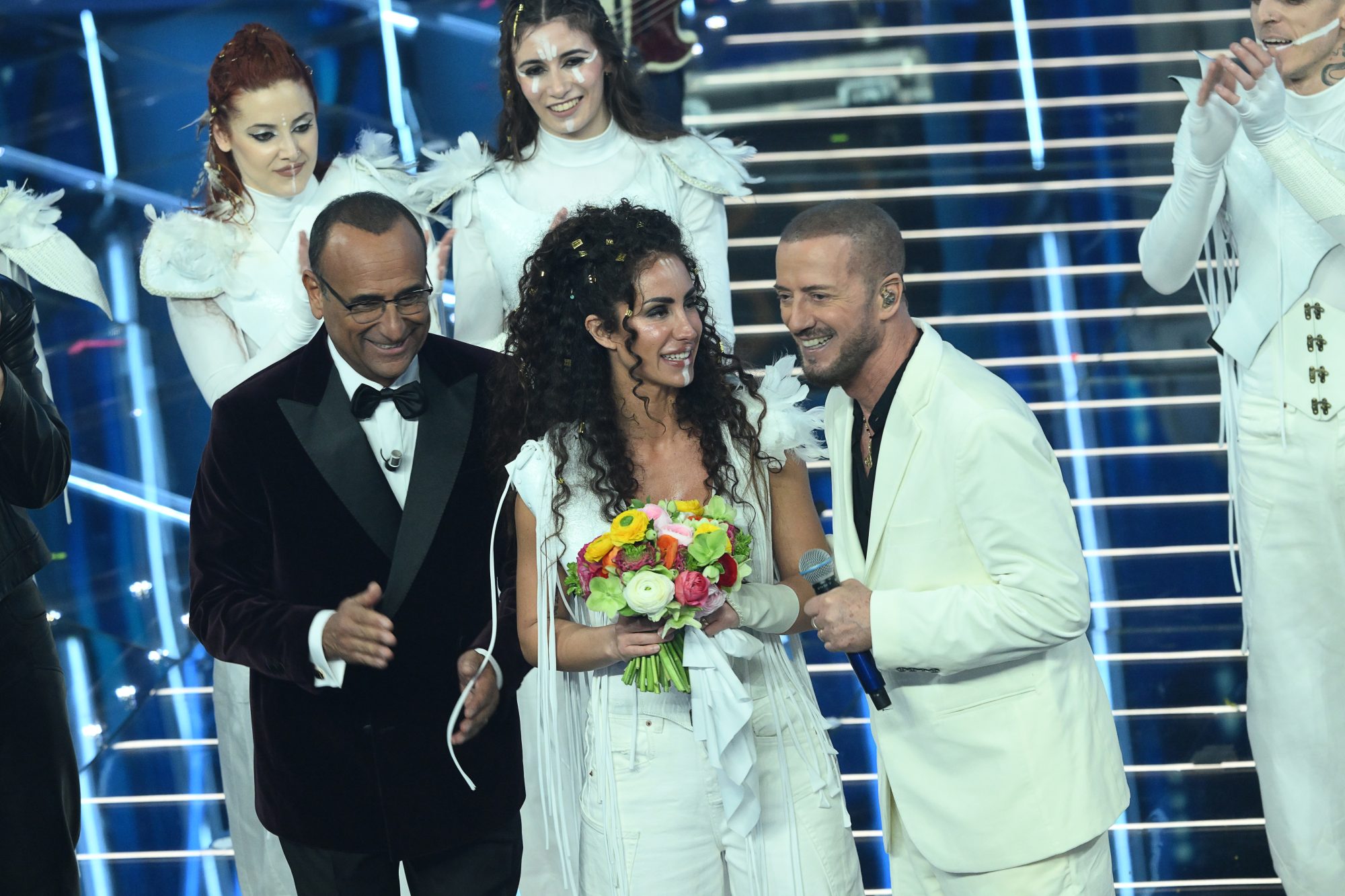 Salutata Rai Radio2, la radio ufficiale del Festival, Conti chiama sul palco il Presidente della Regione Liguria, Marco Bucci, per consegnare il premio ai vincitori per il miglior duetto.