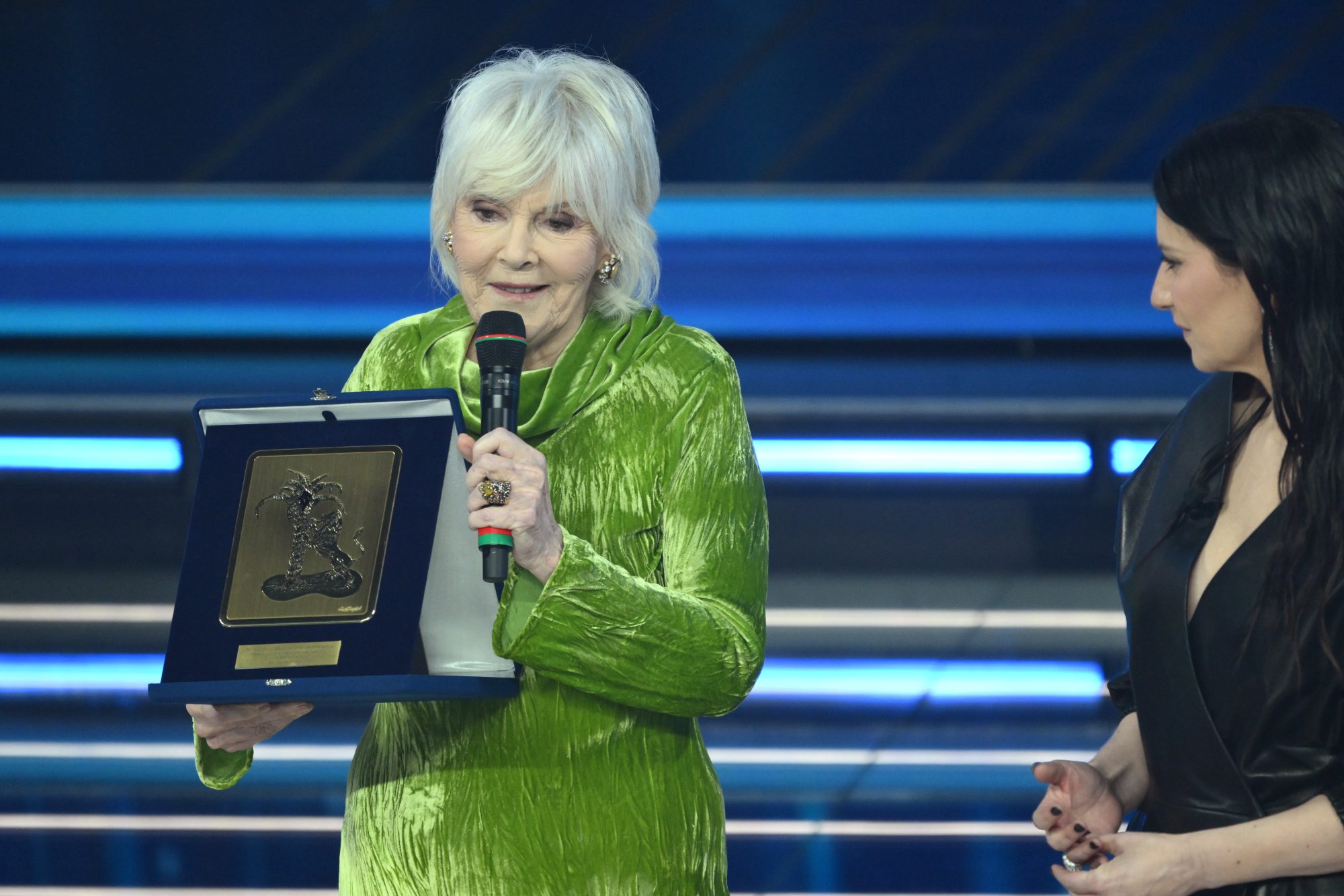 Conti e la Pausini annunciano e accolgono Caterina Caselli, pronta a ricevere il Premio alla Carriera da Alessandro Il Grande, Presidente del Consiglio Comunale di Sanremo.