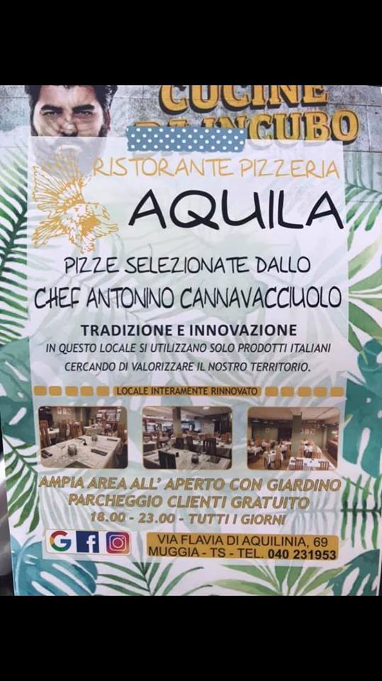 Antonino Cannavacciuolo va a Muggia, in provincia di Trieste, nella terza puntata di Cucine da Incubo 7. La sua missione è quella di salvare il ristorante Aquila, che sta attraversando una grande crisi; ma questa missione gli darà anche l’opportunità di incontrare alcune persone conosciute durante una puntata dell’altro suo programma trasmesso dal Nove, O’ Mare Mio, registrata nella stessa città.