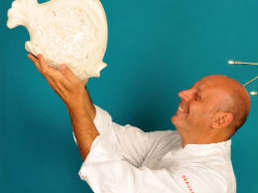 Per il milanese Sergio Barzetti, quarantenne che abita a Malnate (Varese), la cucina è principalmente un gioco, che ha inizio nel momento in cui ci si mette a pensare agli ingredienti necessari per la realizzazione di un piatto. Autore di numerose pubblicazioni dedicate alla cucina e all’intaglio di frutta e verdura, Barzetti organizza corsi, banchetti e serate a tema, spostandosi da una parte all’altra dell’Italia. Il suo motto è “finché c’è brodo c’è speranza”.