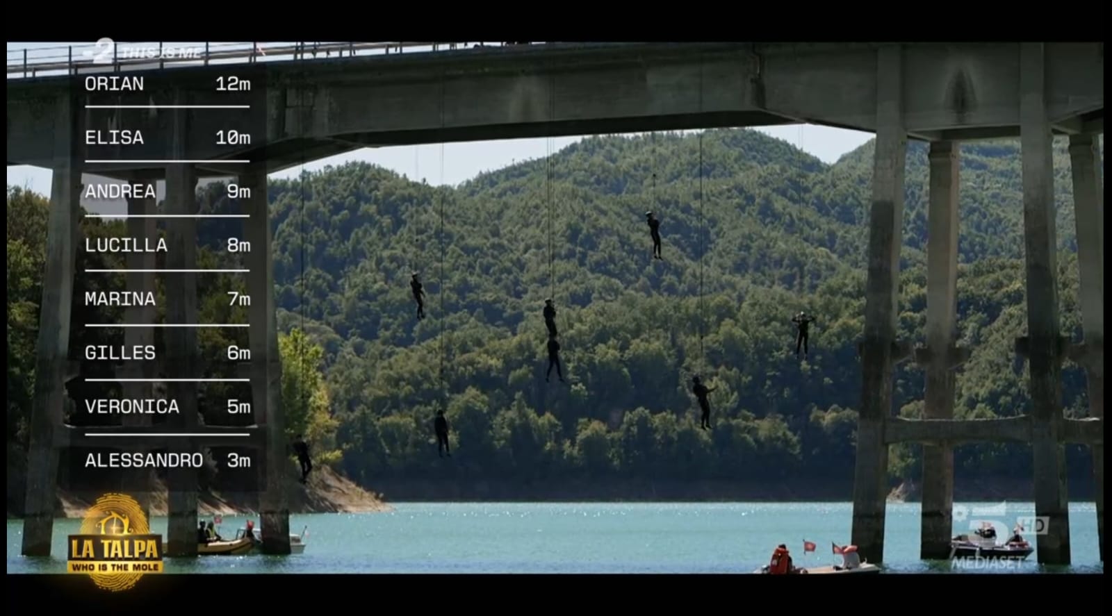Lucilla ha la nausea e Veronica si lamenta ed entra in panico: “Sento che vomita, voglio scendere. Basta. Mi avere rotto il c*zzo con ‘sto gioco“. Marina si arrabbia: “Dovete farla scendere se si sente male“. Arriva Diletta, che invita tutti a togliersi gli occhialini oscuranti. Sorridono quando scoprono di essere sospesi a precipizio sul lago. L’obiettivo è solo uno: sganciarsi e buttarsi in acqua. Pubblicità.