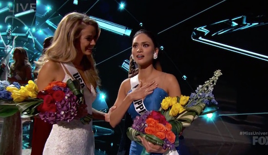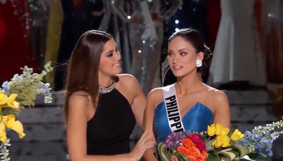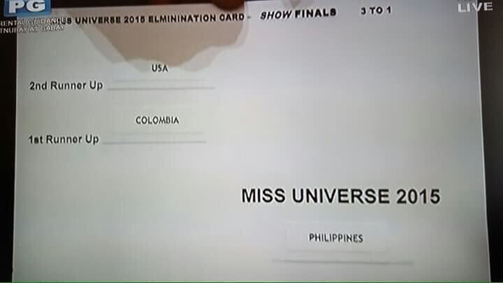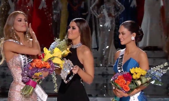 Dal conduttore Steve Harvey arriva l’annuncio: “Miss Universe 2015 is…Colombia!”. Come da prassi Ariadna si commuove ed esulta, mentre la filippina Pia viene fatta scendere dal palco con un omaggio floreale. La presunta Miss Universo 2015 sta salutando e ringraziando, con tanto di fascia e corona già indossate, quando il conduttore torna sul palco: “I have to apologize, the first runner-up is Colombia. Miss Universe 2015 is Philippines!”, che tradotto significa: “Devo chiedere scusa, la seconda classificata è la Colombia. Miss Universo 2015 è..(la concorrente delle) Filippine!”. Alla colombiana è stata quindi letteralmente tolta la corona che già indossava.