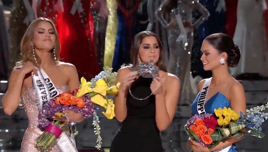 Clamorosa gaffe a Miss Universo: al momento della proclamazione della vincitrice, il conduttore Steve Harvey ha annunciato la reginetta di bellezza sbagliata, per poi risalire sul palco e farle togliere la corona. A vincere non è stata quindi la colombiana Ariadna Gutierrez Arevalo, come tutto il mondo ha creduto per qualche secondo, ma la concorrente delle Filippine Pia Alonzo Wurtzbach, in finalissima con lei.