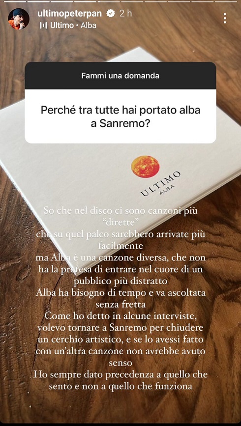 Su Instagram, Ultimo ha spiegato perchè ha partecipato a Sanremo con la canzone Alba: