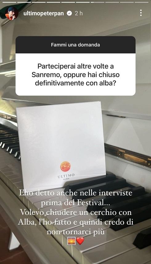 “L’ho detto anche nelle interviste prima del Festival… Volevo chiudere un cerchio con Alba, l’ho fatto e quindi credo di non tornarci più“.