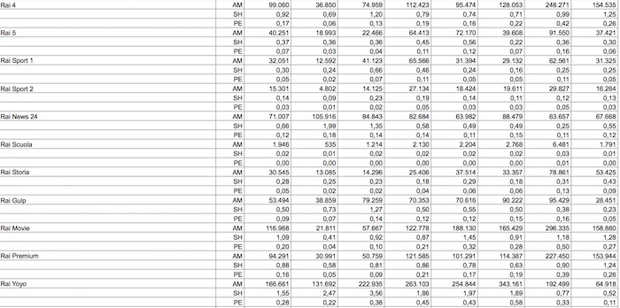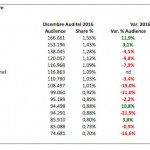 Tra le reti della tv pubblica, Rai Movie conquista la quinta posizione e tocca l’1,09% di share con una perdita di -7,9% vs 2015. Perdite a doppia cifra per Rai 4 e Rai Premium che viaggiano nell’intorno dello 0,9% di share. Ascolti in forte rialzo per Rai News 24 (+42,7%) e uno share che passa dallo 0,46% allo 0,66% per effetto della forte attenzione alla situazione politica italiana in occasione del referendum costituzionale e dell’instabilità a livello internazionale culminata con gli attentati di Berlino e Istanbul.