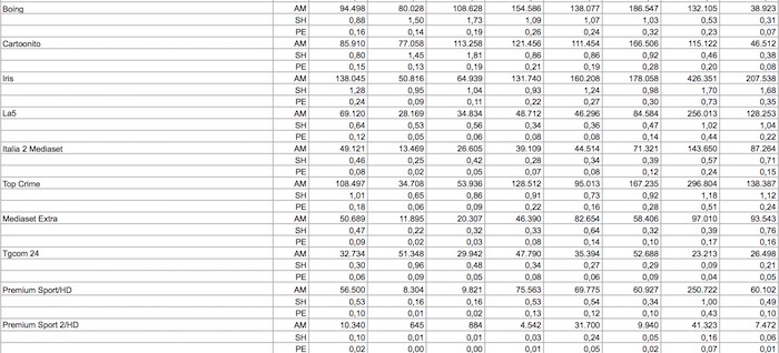 Una programmazione di film (Arma Letale 3, Il Conte di Montecristo, Special Forces – Liberate l’Ostaggio) ben progettata permette a Iris di confermarsi il terzo canale nella classifica (decimo canale nazionale dietro Tv8, qui gli ascolti delle generaliste) con uno share dell’1,28%, pur in calo del -4,5% vs 2015. Flessione marcata per Top Crime (-19%) che supera di poco l’1%, passando dal sesto posto di novembre all’ottavo di dicembre nonostante le serie di successo The Mentalist e Rizzoli & Isles. La 5 e Italia 2 hanno ascolti in linea con l’anno precedente: circa 70 (0,64%) e 50 mila (0,46%). Mediaset Extra, con uno share dello 0,53,%, presenta un calo a doppia cifra (-12%), esauriti gli effetti del Grande Fratello Vip. A Cologno nota positiva per i canali dedicati ai più piccoli: Boing raggiunge lo 0,88% di share con una crescita del +10,8% e Cartoonito arriva allo 0,8% con un incremento del +3,8%. Continua il buon andamento di Premium Sport che ottiene uno share dello 0,53% e un rialzo di ascolti del +22%.