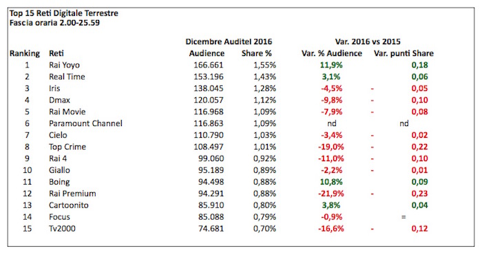 ASCOLTI DICEMBRE 2016 RETI DIGITALI: RAI YOYO (1.55%) SORPASSA REAL TIME (1.43%), EXPLOIT DI PARAMOUNT (1.09%). LA5 FERMA ALLO 0.64%, RAI4 ALLO 0.92%