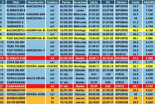 In cima alla lista delle emissioni più seguite c’è la partita di Coppa del Re, Barcellona-Real Madrid, che il 6 febbraio ha raggiunto 7.315.000 spettatori e il 35.9%. Il primato dei programmi entertainment va all’Eurovision Song Contest 2019 che, con i suoi 6.168.000 telespettatori ed il 44,6% di share, ha raggiunto l’ottava posizione della graduatoria generale in cui svettano sport (oltre al calcio, si segnala il basket con l’incontro Argentina-Spagna che ha raccolto 6.168.000 spettatori e il 46.5%) e informazione. Da segnalare, inoltre, l’exploit dei reality di TeleCinco – a cui hanno partecipato i nostri ‘connazionali’ Fabio Colloricchio e Gianmarco Onestini – Supervivientes e Gran Hermano Vip, in ottima salute (capaci di raggiungere il 40% di share e nei segmenti iniziali superare i 4 milioni di spettatori) e presenti in più di un’occasione nella Top50 dei programmi televisivi. La fiction più seguita è stata Matadero su Antena 3 (3.336.000 telespettatori e 21,6%) mentre sulla stessa rete si segnala il quiz Boom – approdato in prima serata per una puntata speciale che ha visto la vincita record di 4.130.000 euro – che ha raggiunto 4.272.000 spettatori e il 28% (prima parte) e 4.148.000 spettatori e il 32.9% (seconda parte).