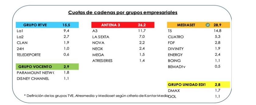 Per quanto riguarda gli altri canali, Cuatro di Mediaset España ha chiuso l’anno con il 5,3% (il risultato meno ‘generoso’ dalla sua nascita), dall’altro laSexta ha guadagnato un po’ di ascolti siglando il 7%. La 2 ha confermato il 2,7% del 2018. Complessivamente parlando, Mediaset España ha raggiunto il 28,9% totale di share, mentre le catene Atresmedia e RTVE hanno chiuso l’anno rispettivamente con il 26.2% e il 15,5%. Vocento (Paramount Network e Disney Channel) e Grupo Unidad (DMAX e Gol) si sono ‘accontentate’ del 2,9% e 2,8%. Da segnalare anche il buon 8% delle reti a pagamento, dove domina MoviStarTv (produttrice di Velvet Collection).