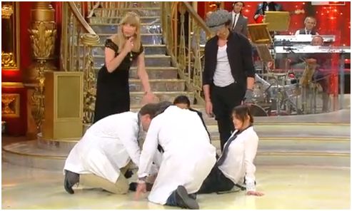 Attorniata dai soccorritori, Anna Oxa è rimasta a terra per qualche momento, mentre la regia rimandava a rallenty le sequenze della caduta. Il tutto, è avvenuto sotto gli occhi della giuria e di un Bruno Vespa lì presente in qualità di ospite. Sempre con le telecamere al seguito, la concorrente è stata coricata su una barella dai soccorritori e portata ad effettuare una radiografia di accertamento. “Anna Oxa ha una lesione ad un legamento però sta tornando in trasmissione, col tutore, per salutare il pubblico” ha poi detto Milly Carlucci. E, di lì a poco, la cantante sarebbe riapparsa in studio.
