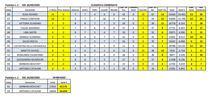 Nel secondo appuntamento, Elisa Isoardi (26 punti) è riuscita a soffiare a Paolo Conticini (24 punti) il primo posto, imponendosi sia nella classifica tecnica, dove è stata aiutata dal tesoretto assegnatole, e sia sui social con 54.504 voti. Recupero notevole anche per Gilles Rocca, che è balzato in avanti fino al settimo gradino (13 punti). Alessandra Mussolini e Maykel Fonts undicesimi (al kick off erano decimi). Fanalini di coda Antonio Catalani e Tove Villfor e Barbara Bouchet e Stefano Oradei, che hanno poi affrontato lo spareggio che ha portato all’uscita di scena dell’attrice.
