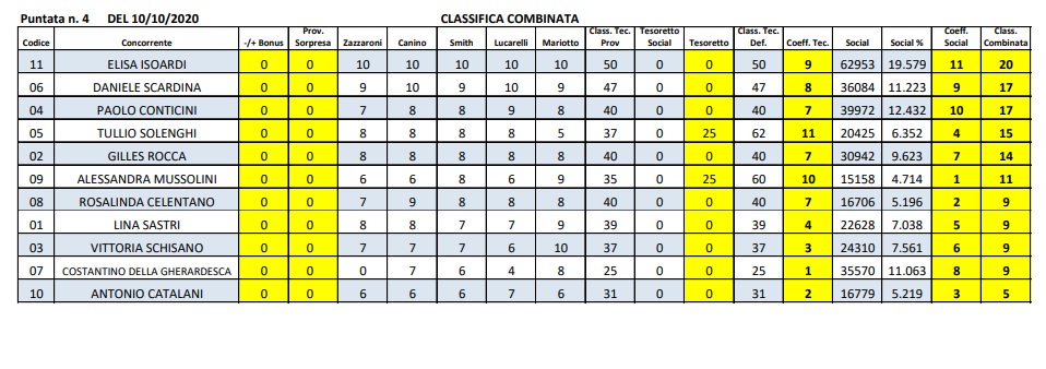 Sette giorni dopo, la Isoardi – con 20 punti nella classifica combinata – è riuscita a riavere la prima posizione, tallonata però da un sempre più apprezzato Daniele Scardina (17 punti). Conticini terzo. Solenghi, nono nella puntata precedente, quarto. E’ continuato invece il percorso altalenante di Rocca, soltanto quinto nella quarta puntata con 14 punti combinati. Vittoria Schisano e Marco De Angelis terzultimi, con spareggio affrontato da Costantino Della Gherardesca e l’eliminato Antonio Catalani.
