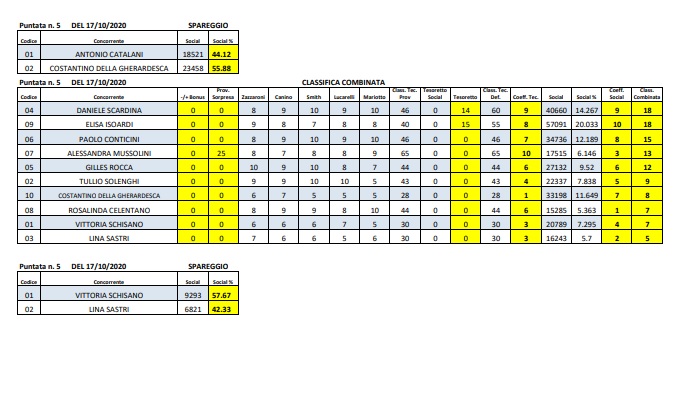 La quinta puntata ha visto un ex equo al primo posto: Daniele Scardina e Elisa Isoardi hanno infatti ottenuto 18 punti. L’uomo è stato più forte dal punto di vista della classifica tecnica, mentre la donna sui social (dove Scardina è secondo). Terzo ancora una volta Paolo Conticini. Gilles Rocca quinto, superato da Alessandra Mussolini. Costantino Della Gherardesca solo settimo, Rosalinda Celentano ottava (solo il 5.3% sui social). Allo spareggio Vittoria Schisano e Lina Sastri, con sconfitta di quest’ultima.