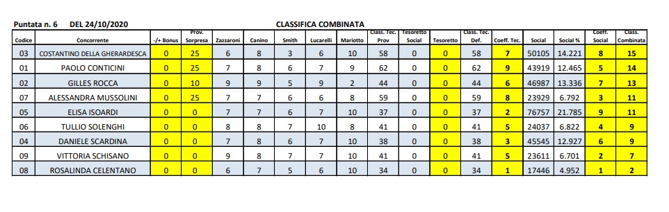 Per merito dei 25 punti ottenuti nella prova speciale, Costantino Della Gherardesca ha ottenuto il primo posto nella classifica generale nel sesto appuntamento, sostenuto fortemente dai social dove è stato il secondo più votato con il 14,2%. Sul podio Paolo Conticini e Gilles Rocca. La Isoardi è sprofondata al quinto posto, soprattutto a causa dei mancati punti acquisiti nella prova speciale. Votatissima invece sui social con quasi il 22%. Daniele Scardina in calo. Allo spareggio Vittoria Schisano ha eliminato Rosalinda Celentano.
