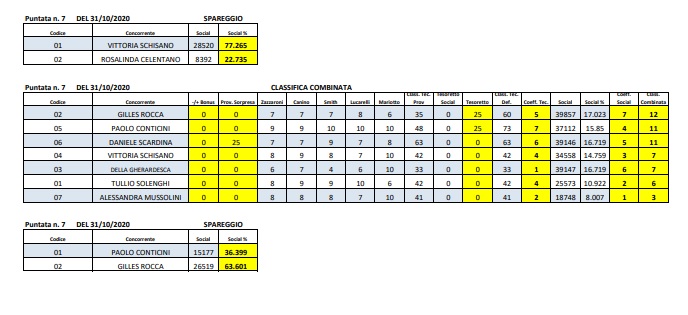La settima puntata, caratterizzata dal ritiro spontaneo di Todaro e Isoardi, ha visto per la prima volta in cima alla classifica Gilles Rocca, che ha ballato da solo per via dell’intossicazione alimentare di Lucrezia Lando. Il podio completato da Paolo Conticini e Daniele Scardina (per un voto terzo sui social dopo Costantino e il primo classificato Rocca). Significative le ultime due posizioni di Tullio Solenghi e Alessandra Mussolini, che però non hanno affrontato lo spareggio. Al termine dell’appuntamento, si sono infatti sfidati i primi due classificati Rocca e Conticini per ottenere dei punti extra per i quarti di finale.