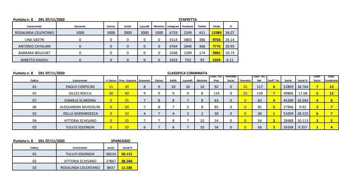 Alla staffetta di ripescaggio, andata in scena nell’ottava puntata, Rosalinda Celentano ha vinto facilmente con il 37%, anche se poi non è riuscita ad entrare in gara grazie allo spareggio finale con Tullio Solenghi (settimo classificato) e Vittoria Schisano (sesta classificata). Grazie alla leadership sui social Paolo Conticini, con 13 punti nella classifica combinata, ha scalzato Gilles Rocca (12 punti). Al terzo posto Daniele Scardina. La Mussolini e Della Gherardesca al quarto e quinto posto.