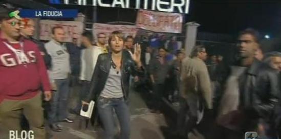 Siamo stufi di sentire le chiacchiere dei politici… Avete giocato sul nostro futuro!” sbraitano i lavoratori della Fincantieri. E dal quel momento parte l’autogestione in diretta tv. La telecamera traballa, poi viene travolta, volano spintoni mentre gli operai accerchiano la giornalista di Rete4 e la sua troupe. Alessandro Banfi, da studio, cerca di capire cosa stia accadendo in mezzo a tutta quella concitazione e manda la pubblicità.