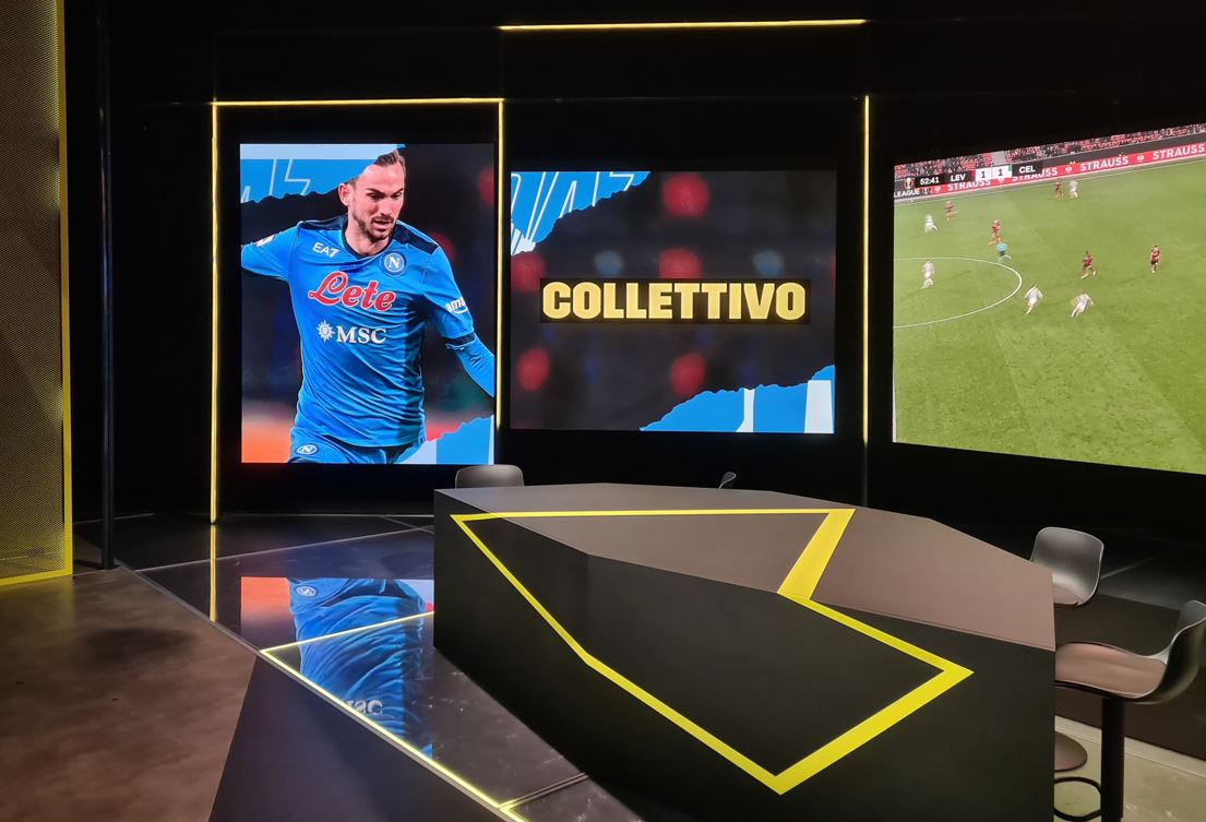Appena entrati negli studi rimaniamo positivamente colpiti dalle molteplici possibilità offerte dall’allestimento: la spaziosa “Square“, con la scrivania dei protagonisti, è il vero centro della scena, ma i videowall attorno sono anch’essi un elemento fondamentale. Una volta accesi, diventano infatti una vera e propria finestra aperta sul mondo calcistico nelle sue varie sfumature. Ogni angolo dello studio, peraltro, è utilizzabile nel caso di particolari esigenze editoriali.