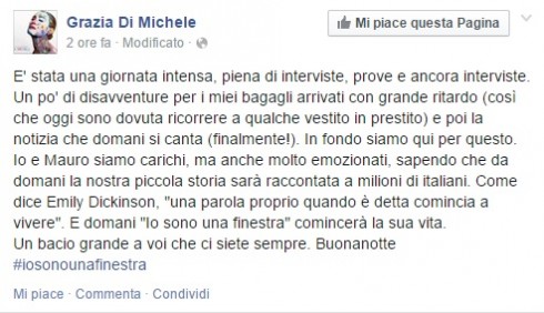 Grazia Di Michele, su Facebook, la notte prima del debutto a Sanremo