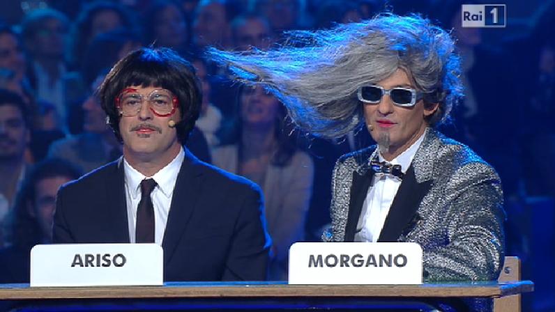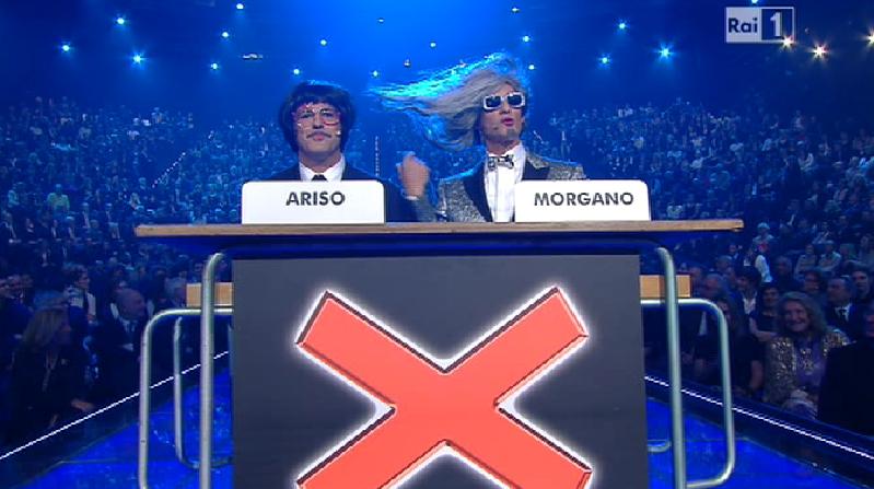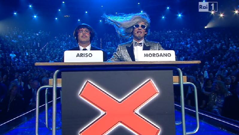 X Factor non poteva chiedere di meglio che una sua parodia portata in scena da Fiorello nel programma evento di questa stagione: non c’era davvero modo migliore per coronare il successo di un format rinato nelle mani di Sky. Fiorello e Marco Baldini vestono i panni di Morgano e Ariso nel finale di Il più grande spettacolo dopo il week end: il primo con un ciuffo sparato esageratamente verso destra, tanto da infilzare il caschetto nero del secondo, tutto timido e accondiscendente.