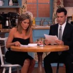 Ospite Jennifer Aniston, il conduttore confessa di essere un grande fan della serie al punto da aver scritto delle fan fiction in cui lui interpretava il ruolo di Ross e consegna il copione all’attrice. Subito dopo, ecco apparire da dietro al sipario una riproduzione fedele della cucina del mitico appartamento di Monica. Rachel e il nuovo Ross cominciano a leggere il copione, che sottolinea le doti a letto del personaggio interpretato da Kimmel, e a sorpresa, nel corso della gag, fanno il loro ingresso Monica (Courtney Cox) e Phoebe (Lisa Kudrow). Solo il cast femminile, però, perchè Chandler e Joey sono morti per colpa di Marcel (la vecchia scimmia di Ross)! Ma bando alle chiacchiere, ecco il video della speciale reunion di Friends: