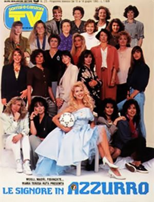 In occasione dei Mondiali di Calcio del 1990 Tv Sorrisi e Canzoni riunisce mogli, fidanzate e mamme degli azzurri impegnati sul campo. Con loro Maria Teresa Ruta, volto femminile de La Domenica Sportiva. Tra le “signore in azzurro” vi è anche un altro volto molto popolare della tv. Guardate bene la copertina e scoprite di chi stiamo parlando.