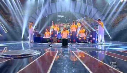 Drum Theatre: i vivaci percussionisti che contano diversi ragazzi autistici avvolgono lo studio con i ritmi e la forza dei tamburi. La commozione e l’entusiasmo è evidente e la giuria premia l’iniziativa del gruppo in ballottaggio con gli stuntman dei Folco Team.