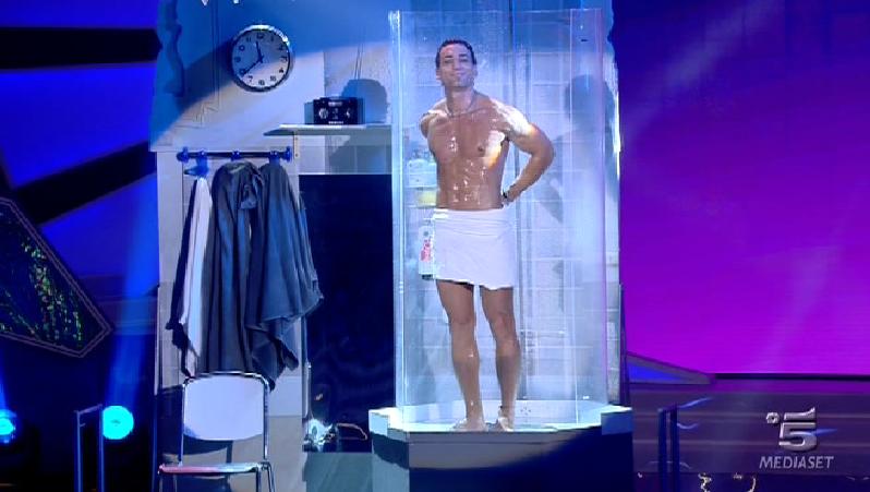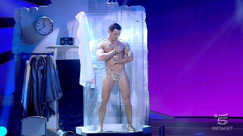 Ore 23.40: annunciato con un bollino rosso in mano da Annicchiarico e Belen, ecco lo spogliarellista Michele Ormella. Non poteva mancare la doccia, ma la mutanda rosa avremmo preferito risparmiarcela.